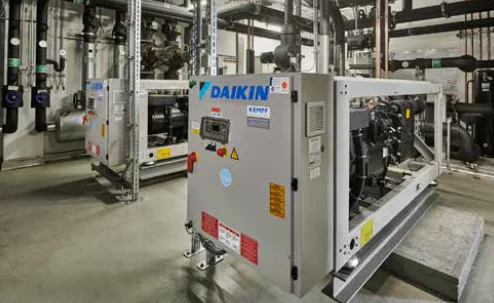 Agregaty chłodzone wodą są przeznaczone do wewnętrznych instalacji w małych, średnich i dużych budynkach. Podobnie jak ich odpowiedniki chłodzone powietrzem, oferują wysoką efektywność energetyczną i możliwość wyboru między samym chłodzeniem a chłodzeniem i ogrzewaniem, z dodatkową opcją sterowania inwerterowego i różnych typów sprężarek.