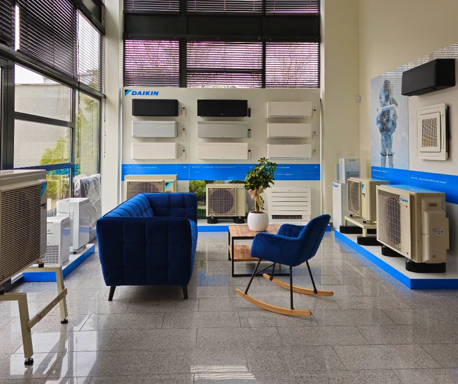 W naszym salonie możesz zobaczyć szeroki wybór modeli klimatyzatorów, pomp ciepła i oczyszczaczy powietrza od renomowanej firmy Daikin.
